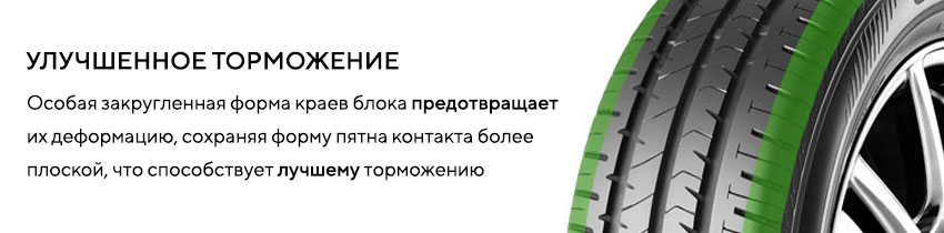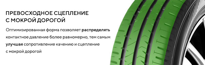 Улучшенное сцепление с мокрой дорогой и сниженное сопротивление качению благодаря инновационной технологии резиновой смеси NANO PRO-TECHTM. Оптимизированная форма протектора повышает сцепление с мокрой дорогой, а закругленные кромки улучшают отвод воды и снижают риск аквапланирования.