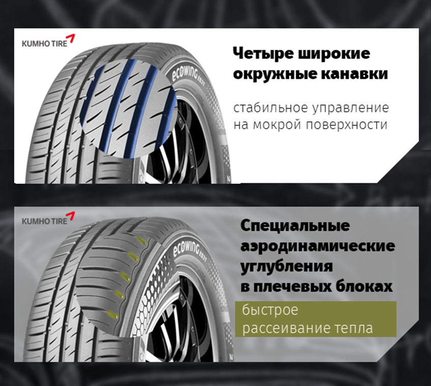 Kumho Ecowing ES31 — это экономичная летняя шина для легковых автомобилей, практичный выбор для повседневной эксплуатации. Разработана как преемница модели Ecowing ES01 KH27 и сочетает высокую износостойкость, надежное сцепление и низкий уровень шума.